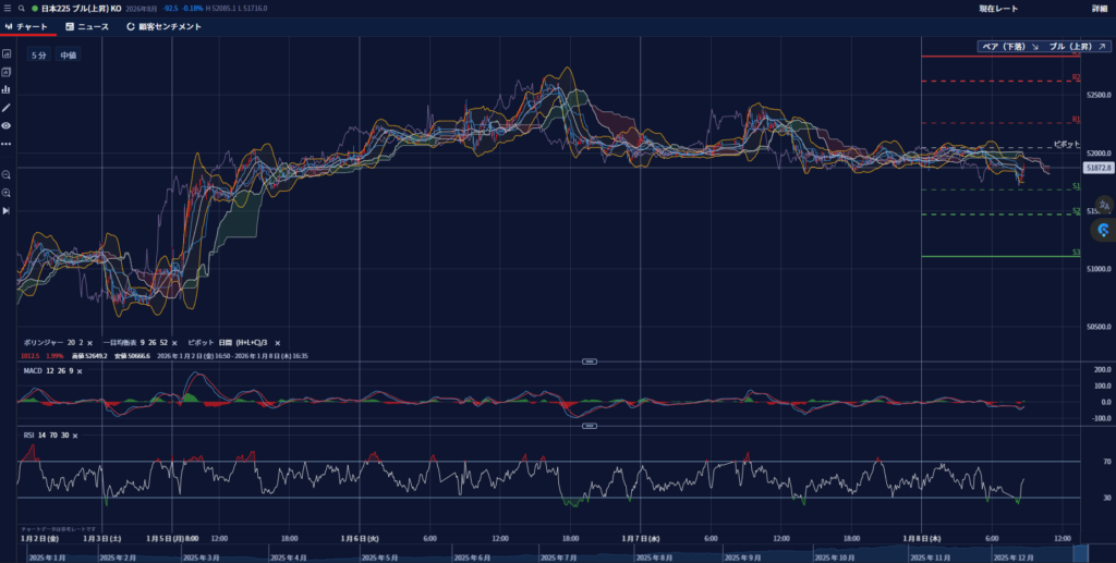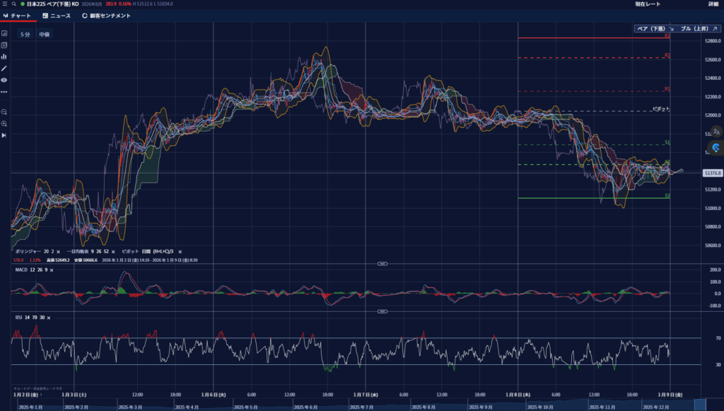 きょう(8日)の東京株式市場は、日経平均株価が前営業日比844円安の5万1117円と続急落。前日と同様に後場に入ると先物を絡めたインデックス売りの砲火を浴び、日経平均は思いのほか下げがきつくなった。表向きは日中関係の悪化、といっても中国側が一方的に先鋭化させている感が強いが、これが重荷となったという見方。また、トランプ米大統領が前日に計66の国際機関から米国が脱退するよう指示する覚書に署名したことも、にわかに国際秩序に暗雲が漂う話であり警戒されている。あすがオプションSQ算出日で、これに合わせた仕掛け的な要素はあったかと思われるが、アジア株もほぼ全面安に近い状態で米株価指数先物も安く、短期的なリスクオンの反動という解釈が妥当なところだ。