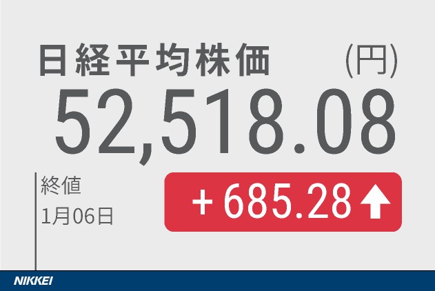 今日は外出の予定があり、市場を見られないのでノートレード。 東証大引け 日経平均は続伸 最高値更新、石油や金融に買い 国内株概況 2026年1月6日 15:56 6日の東京株式市場で日経平均株価は続伸し、終値は前日比685円28銭(1.32%)高の5万2518円08銭だった。2025年10月31日以来、およそ2カ月ぶりに最高値を更新した。前日の欧米株式相場の上昇を受け、リスク許容度を高めた海外投資家からの買いが日本株にも流入した。日経平均の上げ幅は一時700円に迫った。 5日の米株式市場でダウ工業株30種平均は上昇し、25年12月24日以来、約2週間ぶりに最高値を更新した。トランプ米大統領はベネズエラの石油インフラを修復する考えを示しており、同国に権益を持ち、収益に寄与するとの思惑から... -